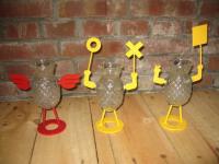 採用回收的玻璃瓶/鳳梨玻璃燭台洗乾淨後 加工鑽孔 加上特製的鐵製底座手部配件 讓整個玻璃器皿活起來 可以用來當撲滿存零錢 或是蓋子拿掉 當成種花的花器