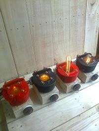 ★ 商品小故事 ★----把生活中的事務變成實用的小物 這就是認真生活的鐵匠職人生活哲學 利用去機車店修車的機會 想到可以把機車的汽缸變成實用的燈具 經過不斷的實驗如何把厚厚的油污給去除掉 再做表面噴砂處理 最後送烤漆 搭配專用的木頭台座