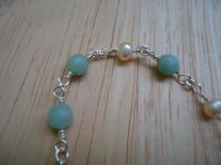 由天然淺淺藍色的花亞馬遜石配上珍珠的手鍊,一顆顆用美國製的鍍銀銅線慢慢編織組合而成,戴上整個人就變成氣質文藝女了!!