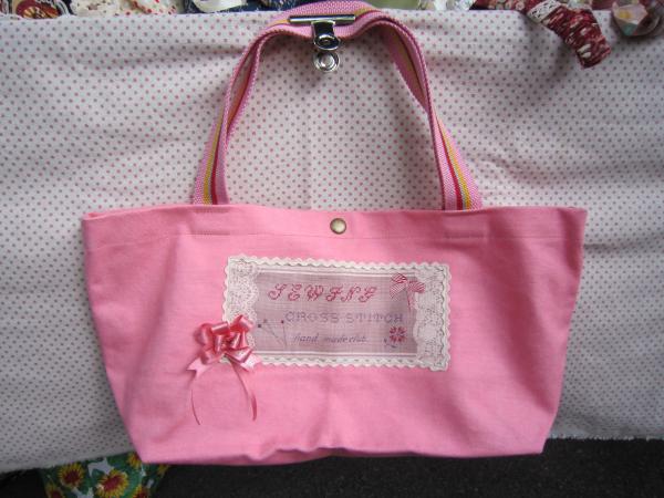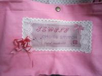 亮粉紅色純棉帆布,桃紅、紅、藍、黃四色棉質織帶提把,袋口中間釘一顆四合釦,無裡布。