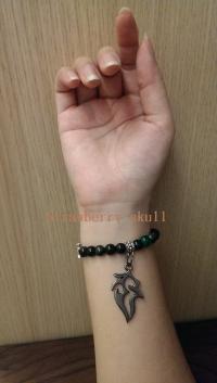 以兩條蠶絲線串製,打結部分用保麗龍膠完成,如果使用一段時間了,寶貝手鏈不會突然斷掉,會慢慢一絲絲斷裂~到時候就可以換線了!
