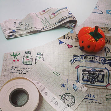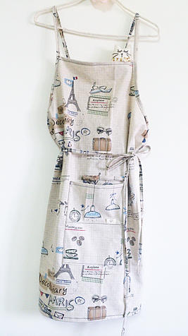 前陣子將買來的韓國棉麻風布首次嘗試製作成工作圍裙, 之前工作上為了規劃設計圍裙的款式, 看了市面上圍裙的眾多款式, 大多是在綁繩的方式做變化 . 我這次配合這塊棉麻布zakka 自然的風格, 印花是手繪巴黎旅行日記 使用很簡易的版型, 穿著方式是綁繩左右各一條穿過左右腰間的小扣環 ,在背後交叉綁蝴蝶結 . 雖然不複雜, 但車縫時兩側包邊還是需要細心製作 .