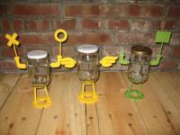 採用回收的玻璃瓶/鳳梨玻璃燭台洗乾淨後 加工鑽孔 加上特製的鐵製底座手部配件 讓整個玻璃器皿活起來 可以用來當撲滿存零錢 或是蓋子拿掉 當成種花的花器