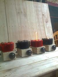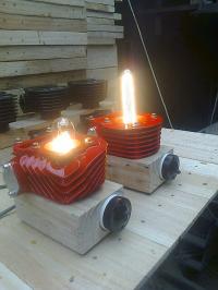 ★ 商品小故事 ★----把生活中的事務變成實用的小物 這就是認真生活的鐵匠職人生活哲學 利用去機車店修車的機會 想到可以把機車的汽缸變成實用的燈具 經過不斷的實驗如何把厚厚的油污給去除掉 再做表面噴砂處理 最後送烤漆 搭配專用的木頭台座
