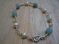 由天然淺淺藍色的花亞馬遜石配上珍珠的手鍊,一顆顆用美國製的鍍銀銅線慢慢編織組合而成,戴上整個人就變成氣質文藝女了!!