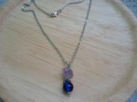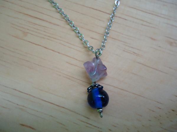 材質: 天然螢石+深藍色琉璃珠,銀色合金配件.銀鍊