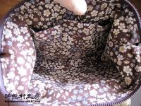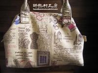 縫紉英文報紙圖案棉質表布,內袋為咖啡色小花花布。