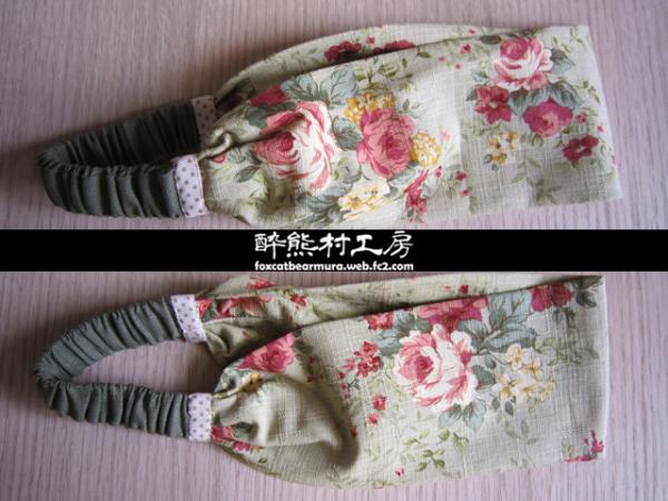 綠色系玫瑰花草圖案髮帶,鬆緊帶部份為墨綠色棉布,接合處為點點淺米色緞帶。
