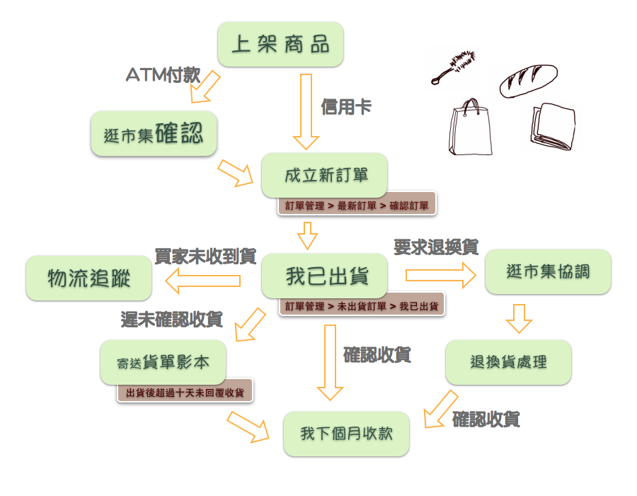 逛市集每月的1號會總結上個月的營收,寄出營收報表給攤主,你也可在攤主管理後台中隨時查看自己的營收報表,當月營收會在10號 前匯給攤主,從營收報表中,攤主可以清楚看到自己的所有交易明細,包括: